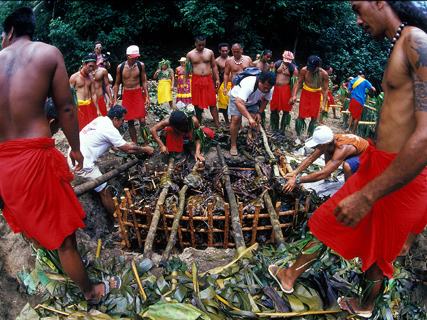 The ma’a Tahiti is prepared in the traditional way using the “Ahi ma’a”, the traditional Tahitian oven. This oven is in fact, a simple pit dug in the ground layered with wood. Porous volcanic stones are placed over the wood layer. Once the wood has been consumed by the fire, the stones are transformed into an efficient heat source. Once the adequate temperature has been reached, the stones are covered with banana leaves.
