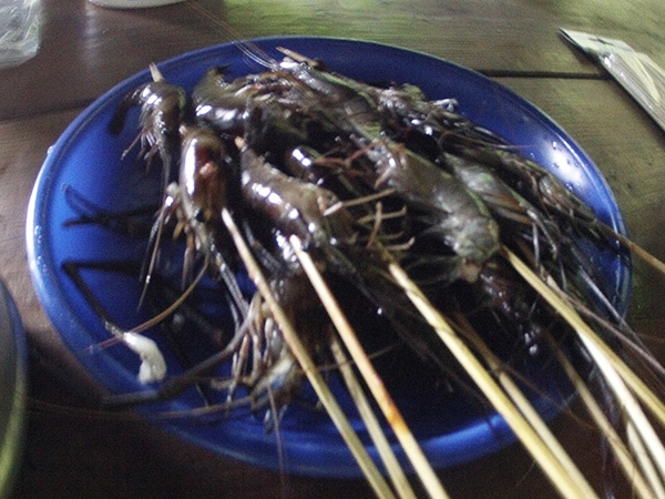 The next morning passed so quickly that everybody was already enjoying breakfast. The shrimp provided a welcome addition to our « Tahitian » breakfast. The warm weather even allowed us a quick “dip” in the river.