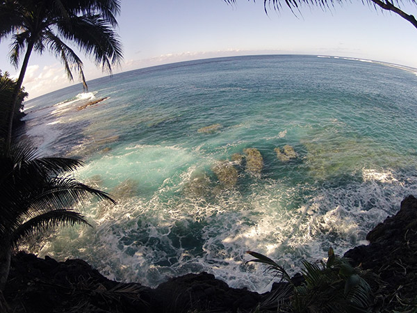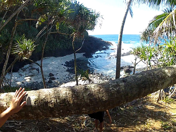 The first part of the trek took us through a lot of tropical vegetation. With the plants humid from the morning dew, our shoes were quickly covered in mud. At a calm relaxed pace, we took in our natural surroundings; lush vegetation and the rolling sea just a few meters below us. After trekking a good hour, we arrived at a small stream that flowed from the mountain side into the sea; the perfect place to take a break. There, we spent a bit of time observing some of the natural “lava tunnels” naturally “sculpted” by the water…